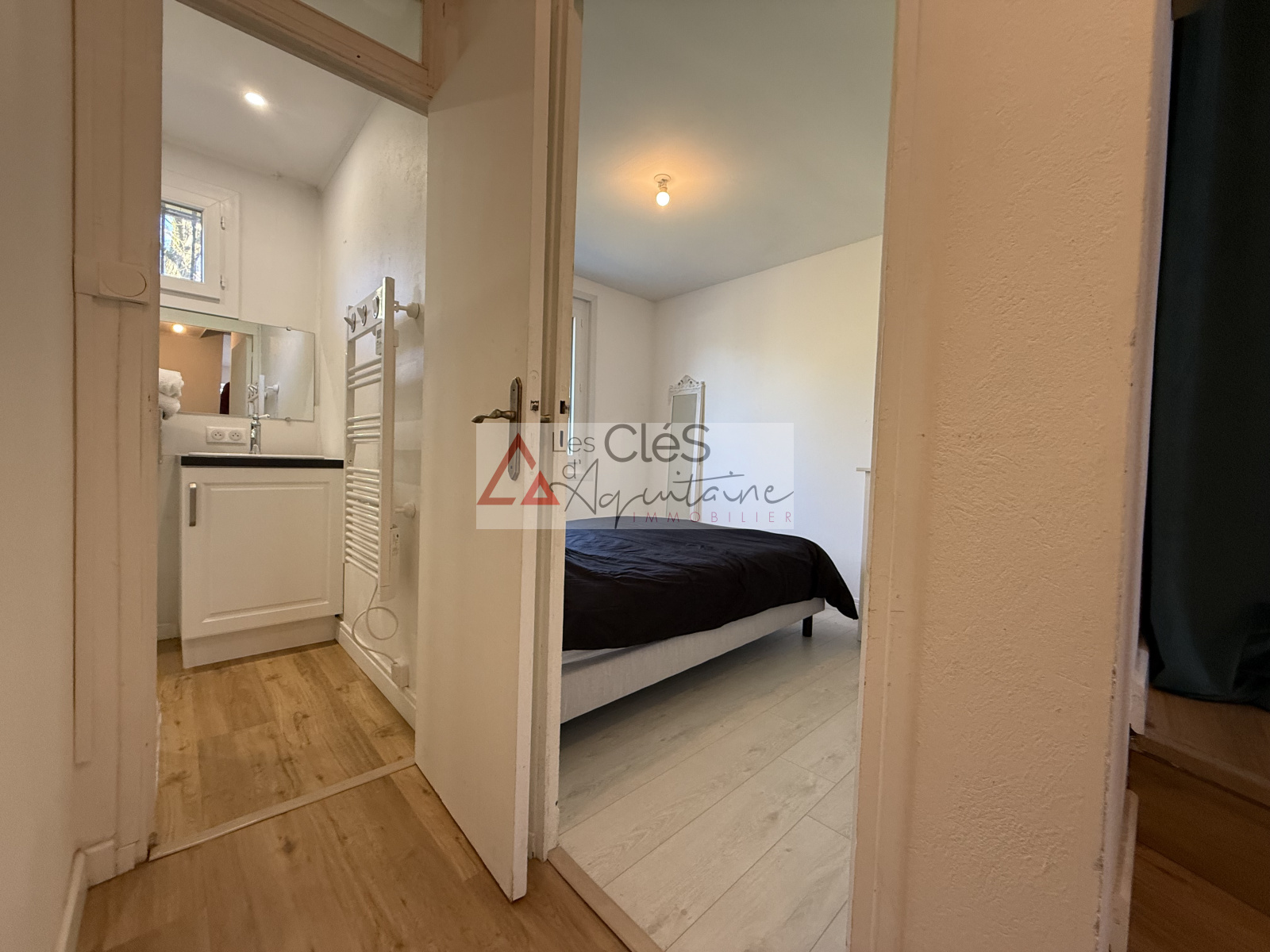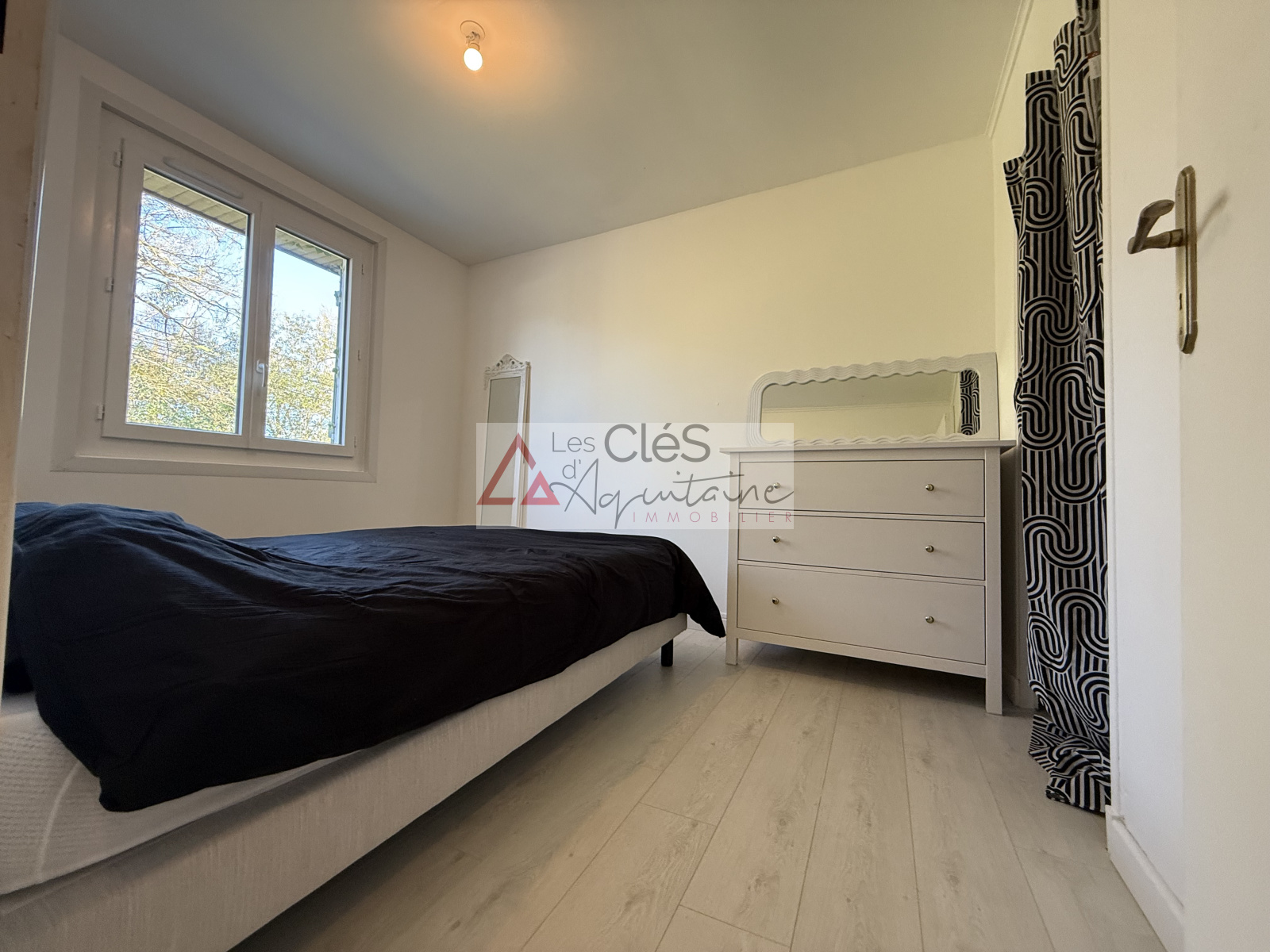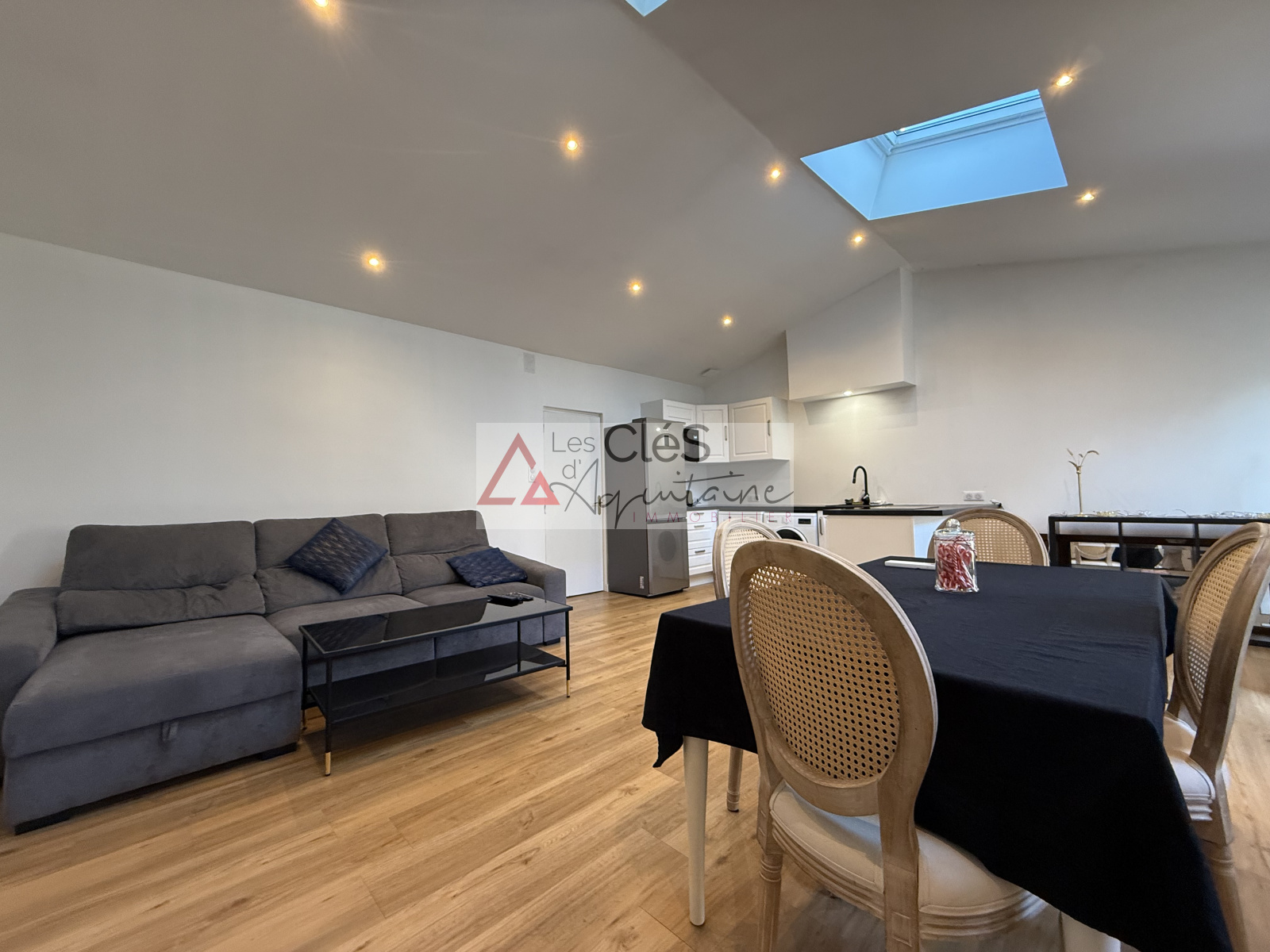 Elle se compose d’une cuisine meublée et équipée, ouverte sur un séjour lumineux, créant ainsi un espace de vie convivial et fonctionnel. En contrebas, un dégagement dessert deux chambres et une salle d'eau.
