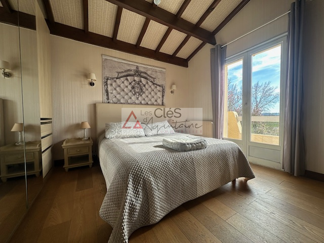 Au rez-de-chaussée, vous découvrirez une cuisine meublée et équipée, ouverte sur une spacieuse pièce de vie chaleureuse, agrémentée d'une cheminée à foyer ouvert et d'un poêle à bois, créant une atmosphère conviviale et authentique. Une grande buanderie avec accès direct au garage facilite le quotidien. Ce niveau propose également une vaste chambre avec sa salle d'eau privative, dotée d'une élégante douche à l'italienne, ainsi qu'un wc indépendant.