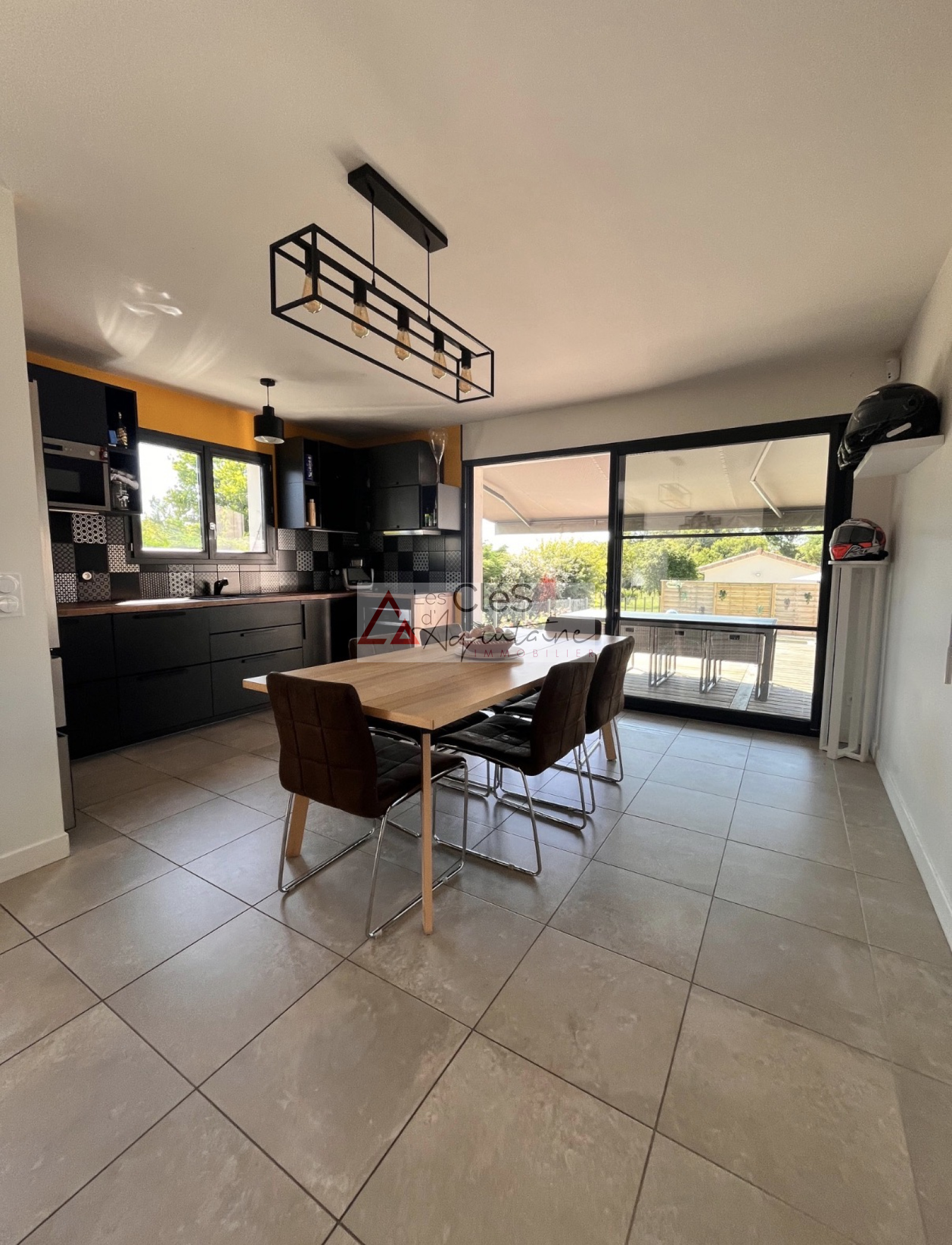 La maison principale, construite en 2020 et encore sous garantie décennale, offre de belles prestations modernes. L’espace de vie, spacieux et lumineux, comprend un salon, une salle à manger avec une cuisine contemporaine, meublée et équipée, ouverte.