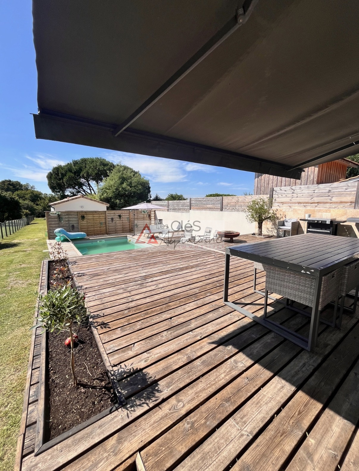 Une grande baie vitrée donne accès à une vaste terrasse avec piscine creusée, idéale pour profiter des beaux jours.